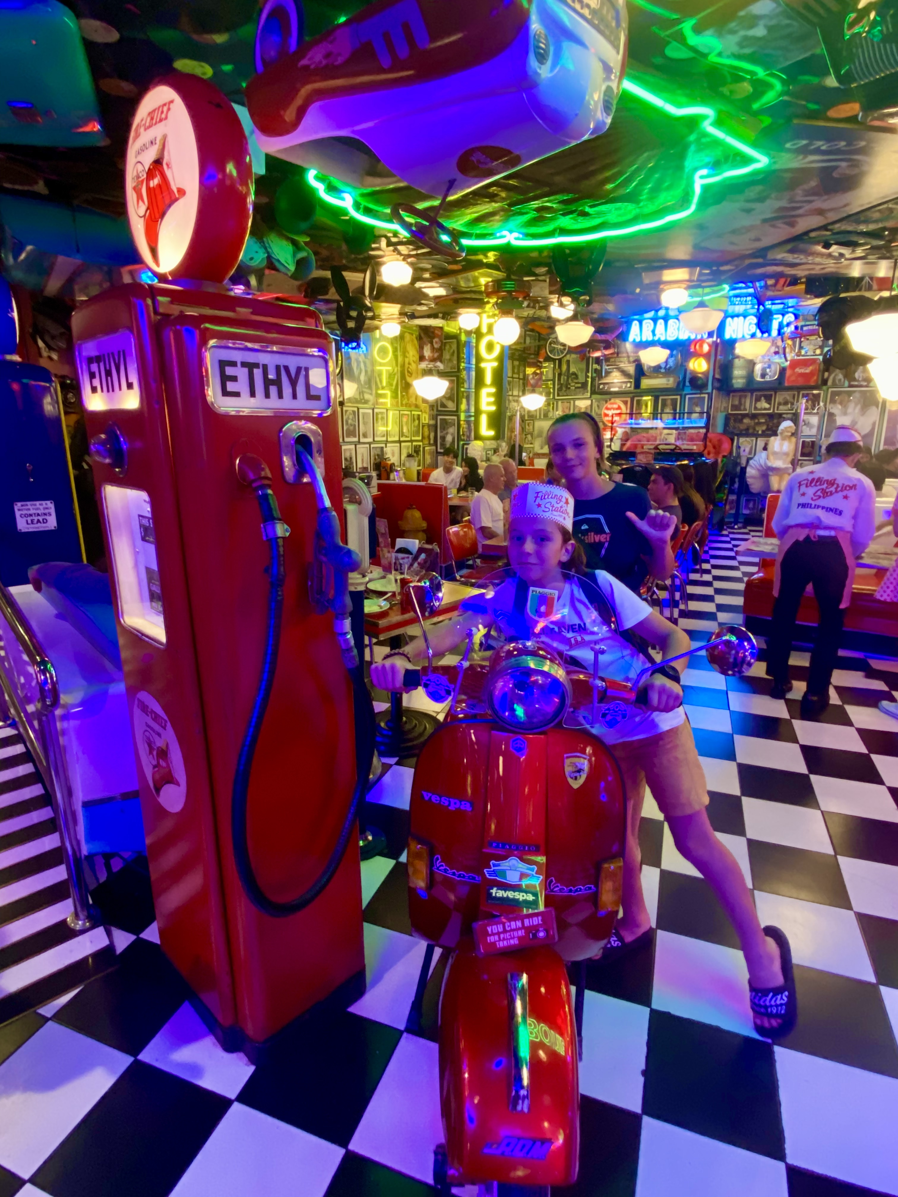 Notre hôtel est à coté de la très sulfureuse Burgos Street. Parmi mille choses bien peu recommandables, il y a un restaurant plutôt original : le Filling Station Bar and Café. C’est un immense restaurant américain typique des années 60. La déco est folle. Si vous voulez prendre 2500 calories en compagnie du sosie asiatique d’Elvis, c’est là qu’il faut aller. 😂