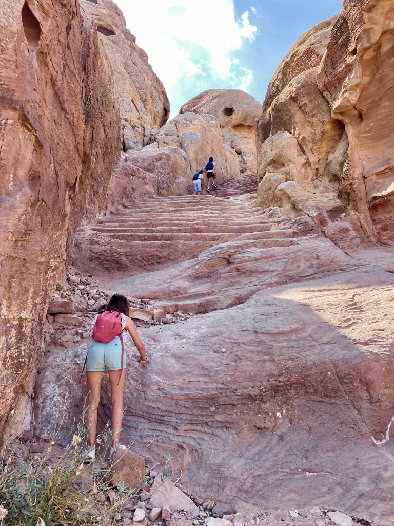 Arrivés au bout du chemin principal, nous nous trouvons face à un escalier de 800 marches menant au Monastère Ad Deir. Il faut encore compter 45 minutes de marche pour y parvenir et Margaux est fatiguée. Il faut dire que nous avons marché sous une chaleur accablante. Pensez à prendre de l’eau et de quoi vous protéger du soleil. Nous décidons donc de reporter la visite du monastère au lendemain et de la coupler avec la visite de Little Pétra. Nous rebroussons donc chemin pour rentrer et repassons avec joie devant tous les bâtiments déjà vus.