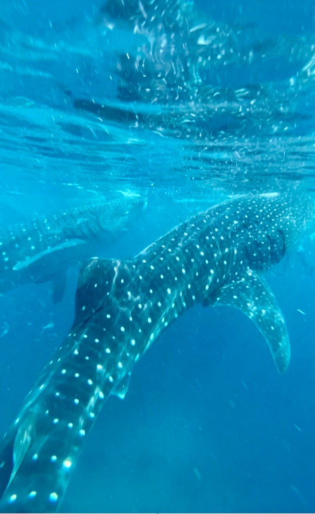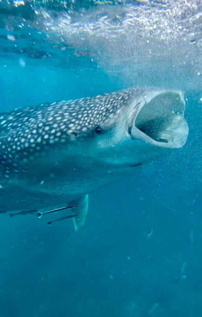 Nous avons vécu un moment inoubliable en dépit de la pratique contestée du feeding. Pendant 30 minutes, nous avons eu l’opportunité de nager avec les requins, de les observer et de se sentir si petits à côté d’eux. Les spécimens présents font une dizaine de mètres de long et il y en a huit. La sensation de les sentir nous frôler restera gravée. Il y a eu aussi quelques frayeurs de les voir avancer derrière soi gueule ouverte. N’est-ce pas Théo ? 😱
