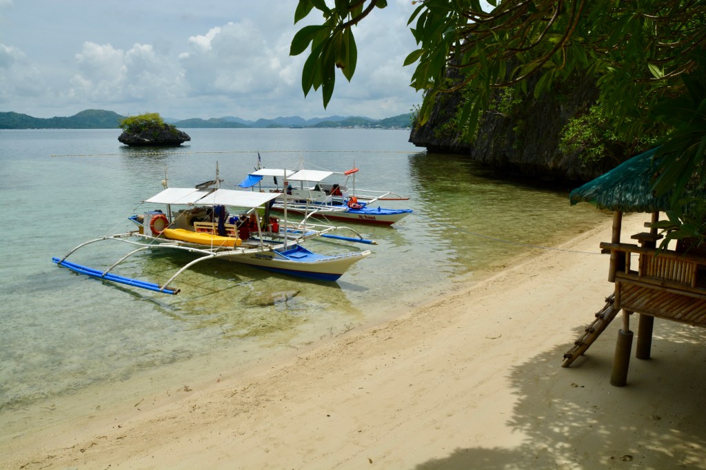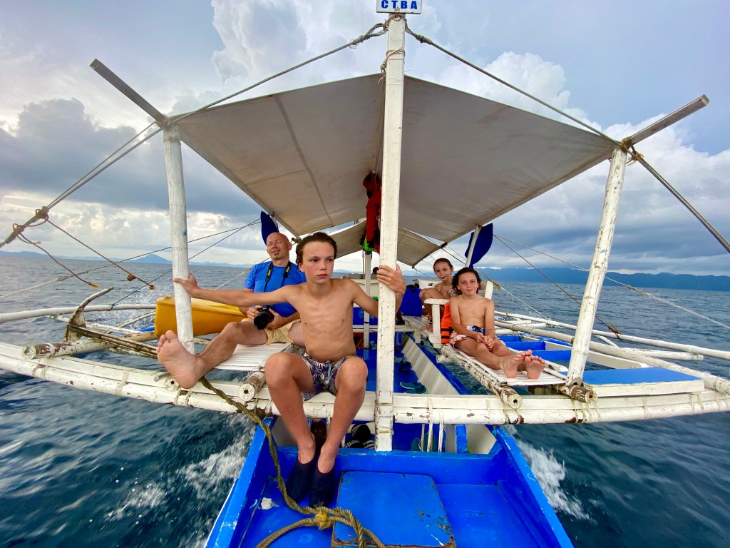 Nous nous réveillons aux aurores pour embarquer avec Arjay Pontilar pour une croisière privée en baie de Coron. Il est particulièrement sympathique et était venu la veille à notre hôtel pour nous rencontrer et nous expliquer la prestation proposée. Nous sommes tous les cinq sur un banca, un bateau traditionnel en bois muni de deux flotteurs latéraux en bambou. Il y a avec nous trois hommes d’équipage : un pour tenir la barre, un pour cuisiner et un pour effectuer les manoeuvres. Tout au long de la croisière, l’équipage a été aux petits soins pour nous et pour les enfants. Les repas préparés en mer sont excellents et copieux.