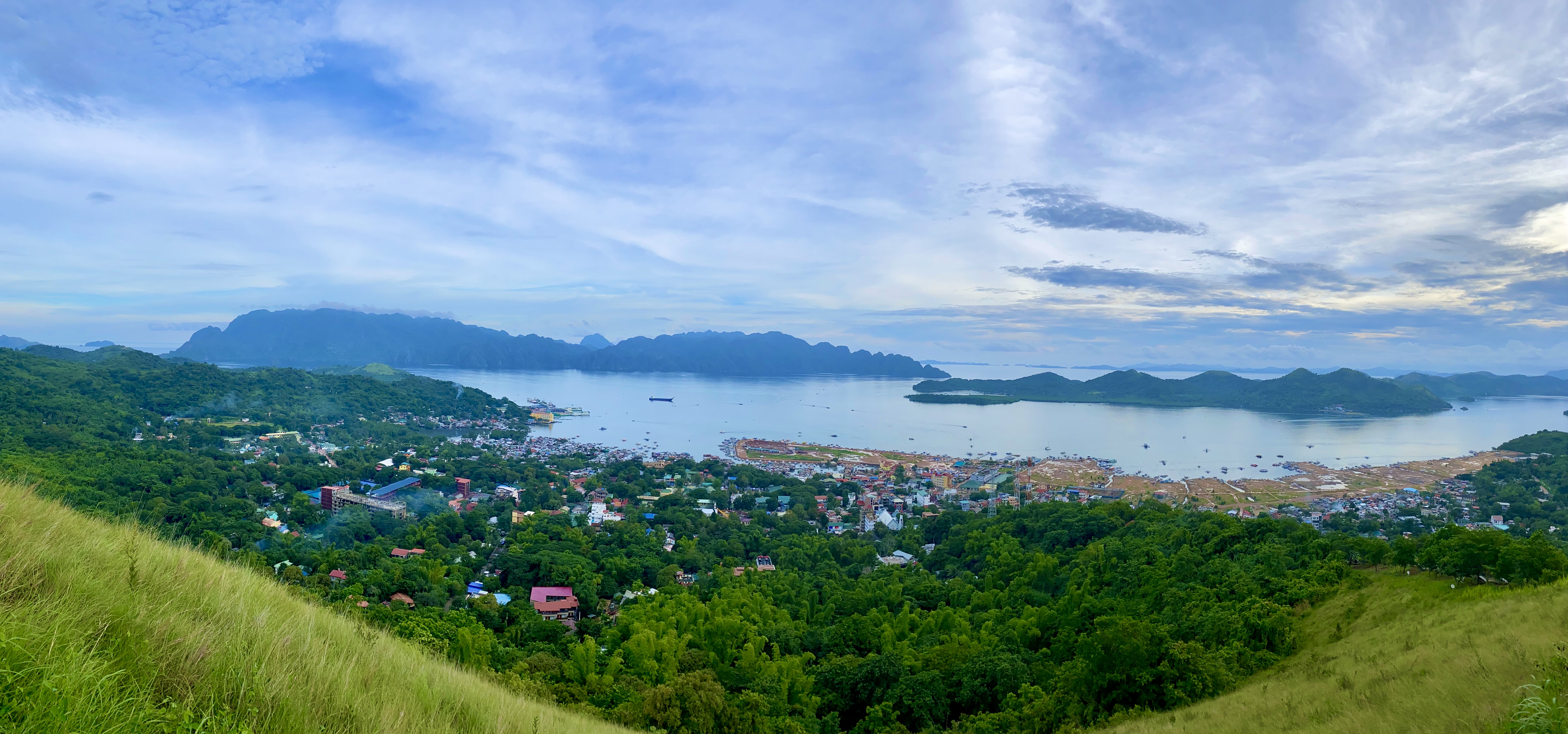 En fin d’après-midi, nous prenons un tuk-tuk et filons vers Coron. En 10-15 minutes, nous arrivons au bas du sentier qui mène au sommet du mont Tapyas. Le point de départ du sentier se trouve au point « K-Heights Inn » sur Google Maps. La montée se fait facilement. Il faut environ 20 minutes pour gravir 721 marches bétonnées. Quelques haltes s’imposent quand même au moins pour admirer le paysage. Avant d’atteindre le sommet vous verrez sur votre droite l’immense panneau « CORON » qui rappelle celui que l’on peut voir à Hollywood. On le voit de partout en ville. Nous profitons d’un magnifique coucher de soleil. Depuis le sommet, la vue sur la baie est incroyable. Il nous tarde de la découvrir au fil de l’eau.