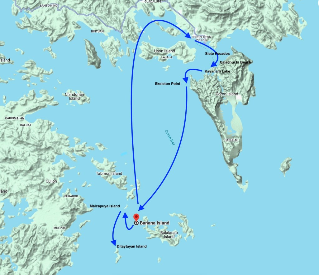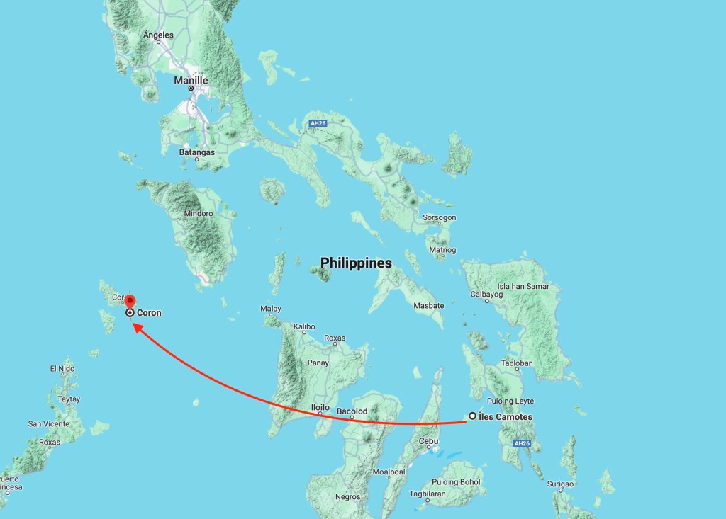 Nous prenons un bateau de Camotes au port de Danao (2 heures de traversée – prix : 1260 PHP pour 5 soit 21 €) puis montons en taxi pour rejoindre l’aéroport de Mactan (2 heures – prix : 1200 PHP pour 5 soit 20 €). Nous avons dormi une nuit à Cebu car notre avion décollait trop tôt par rapport aux horaires des bateaux. De manière générale, les transports sont longs et il faut limiter le nombre d’îles pour mieux profiter de son séjour. Nous décollons de Cebu pour atterrir Busuanga, l’aéroport de Coron (prix : 14 150 PHP pour 5 soit 230 €). Nous prenons ensuite un taxi de Busuanga jusqu’à l’hôtel (700 PHP pour 5 soit 12€). Vous avez suivi ? ⛴️🚕✈️🚕 . Allez je vous montre où nous sommes sur la map.