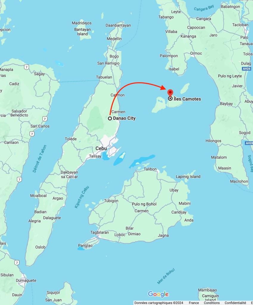 Nous avons quitté l’île de Cebu et arrivons en bateau dans les Camotes. Le trajet n’est pas long (seulement 4 miles soit 6,5 km). Nous sommes à l’Est de Cebu (voir notre article) et au Nord de Bohol (voir notre article).