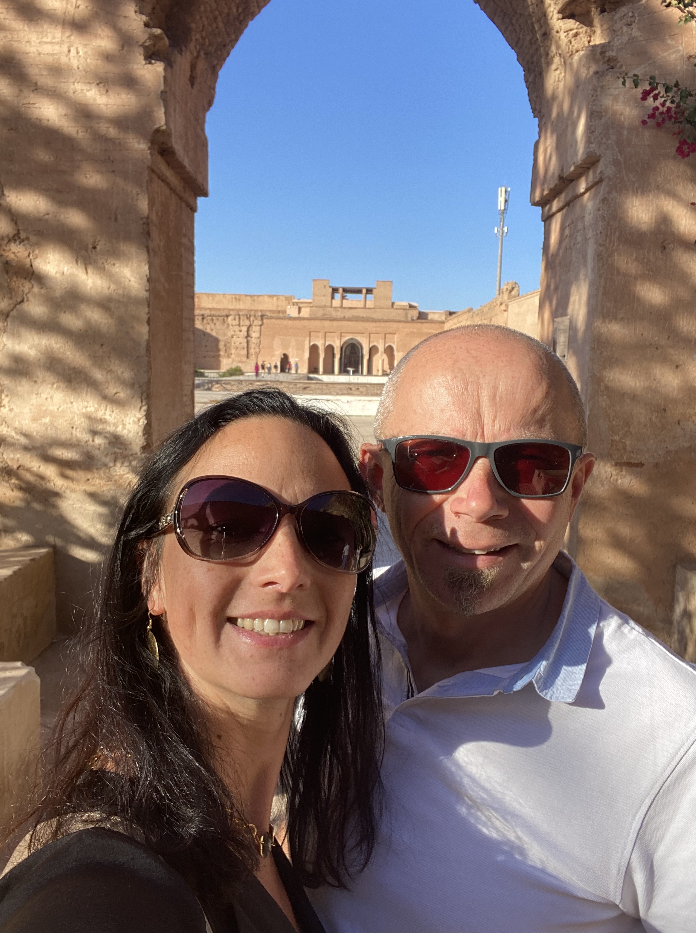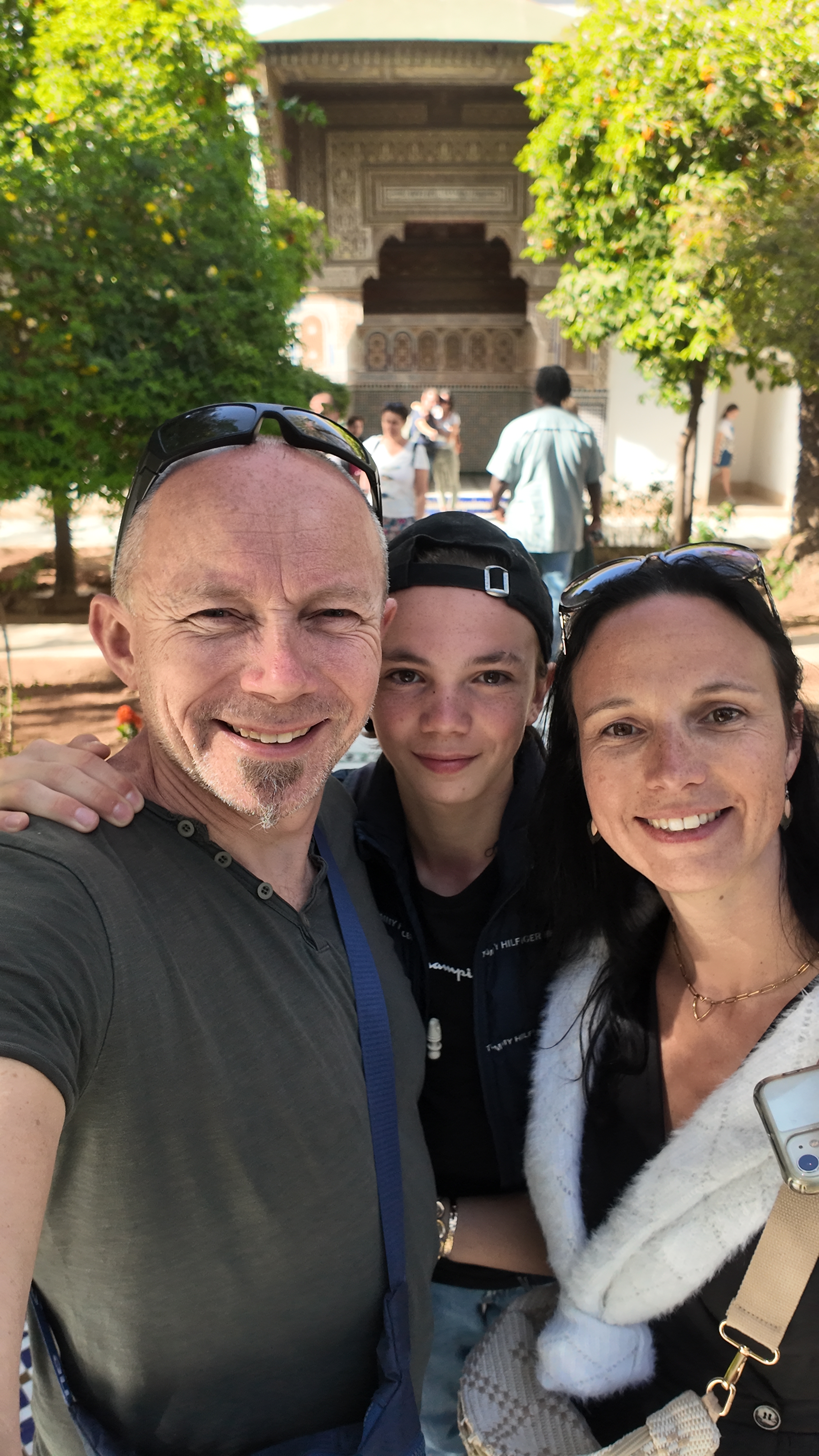 On compte quatre villes impériales au Maroc et chacune est associée à une couleur différente : le bleu pour Fès, le vert pour Meknès, le blanc pour Rabat et l’ocre pour Marrakech. On peut se rendre à Marrakech pour une semaine ou seulement pour un week-end. Anaïs et moi y sommes allés trois fois, en 2019, 2022 et 2024, pour une durée totale de trois semaines. On peut dire que l’on connaît très bien la ville. Nous avons voyagé avec nos trois ados, Hugo, Théo et Margaux, qui ne connaissaient de l’Afrique que l’Egypte. Nous étions heureux de leur faire découvrir cette ville que nous aimons tant. Au fait… pour faire genre, ne dites pas Marrakech mais « Kech » 🤪.