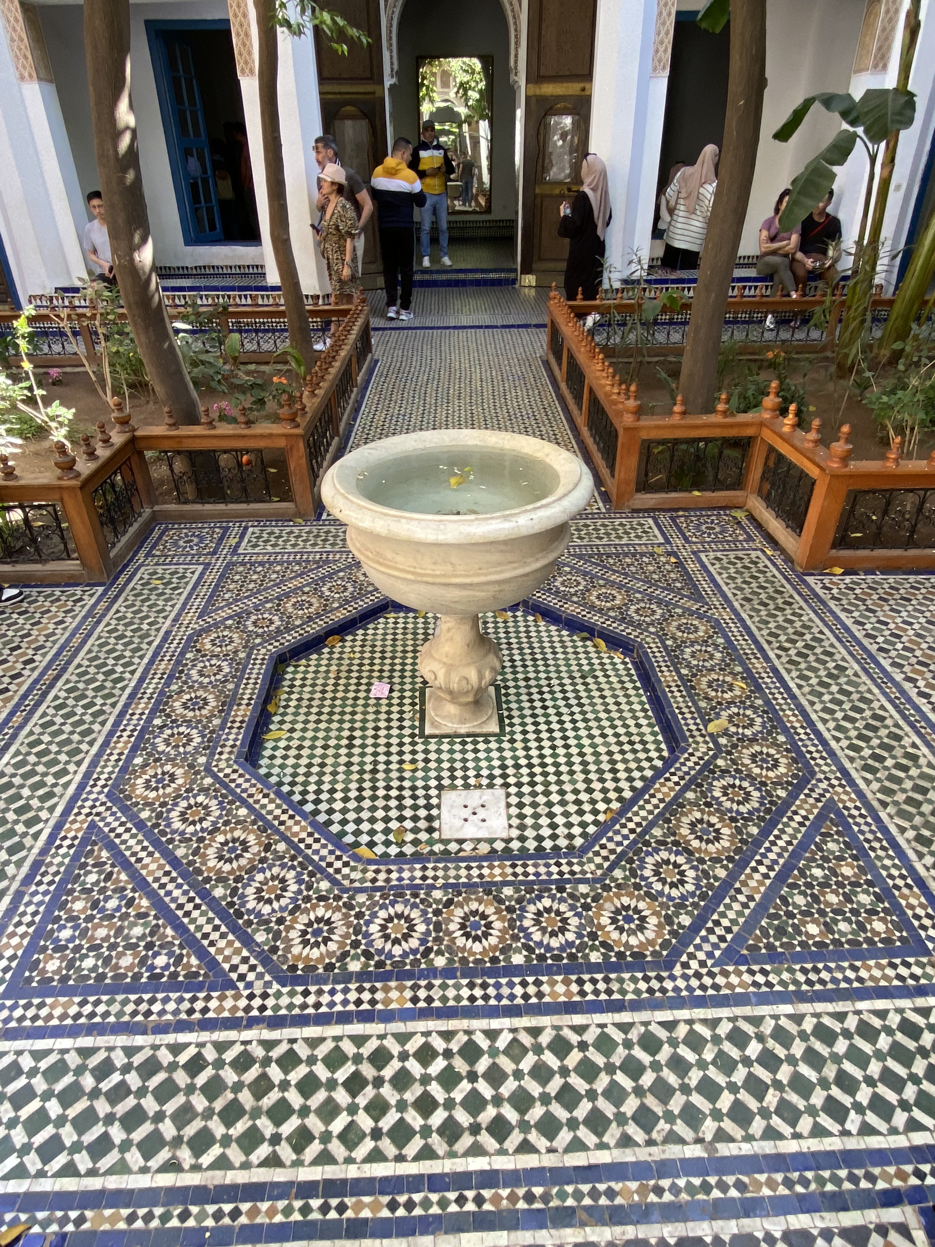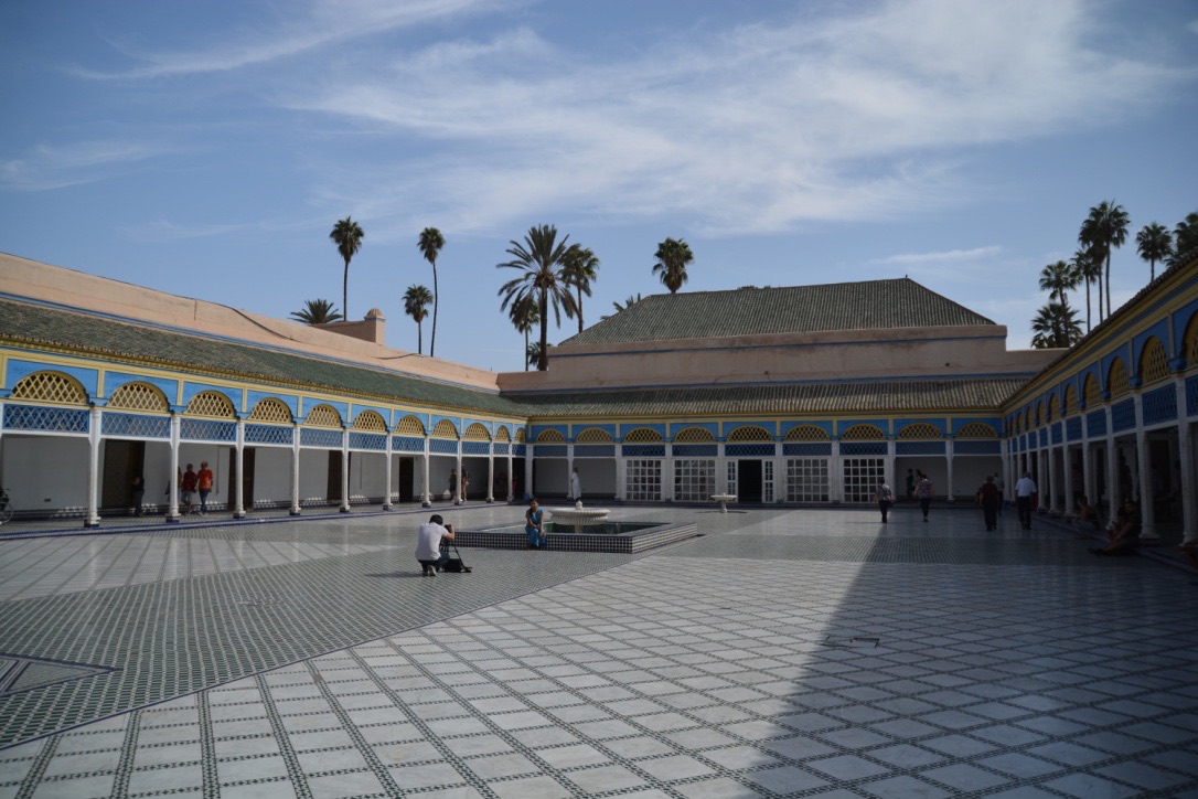 En remontant la rue, on arrive sur la place des Flerbantiers juste à côté du Palais de la Bahia (10 à 15 minutes depuis la place Djemaa el-Fna). Il faut compter au minimum une heure pour avoir le temps de profiter de ce magnifique palais construit au XIXe siècle. Il y a beaucoup de choses à voir : cent cinquante pièces (appartements privés et harems), des cours intérieures, des patios et des jardins mauresques. C’est une splendeur. D’ailleurs, Bahia signifie « La Belle ». La cour d’honneur et la grande salle du conseil sont splendides. Profusion de zelliges, de stucs et de plafonds en bois sculptés. C’est l’un des sites les plus visités de la ville..
