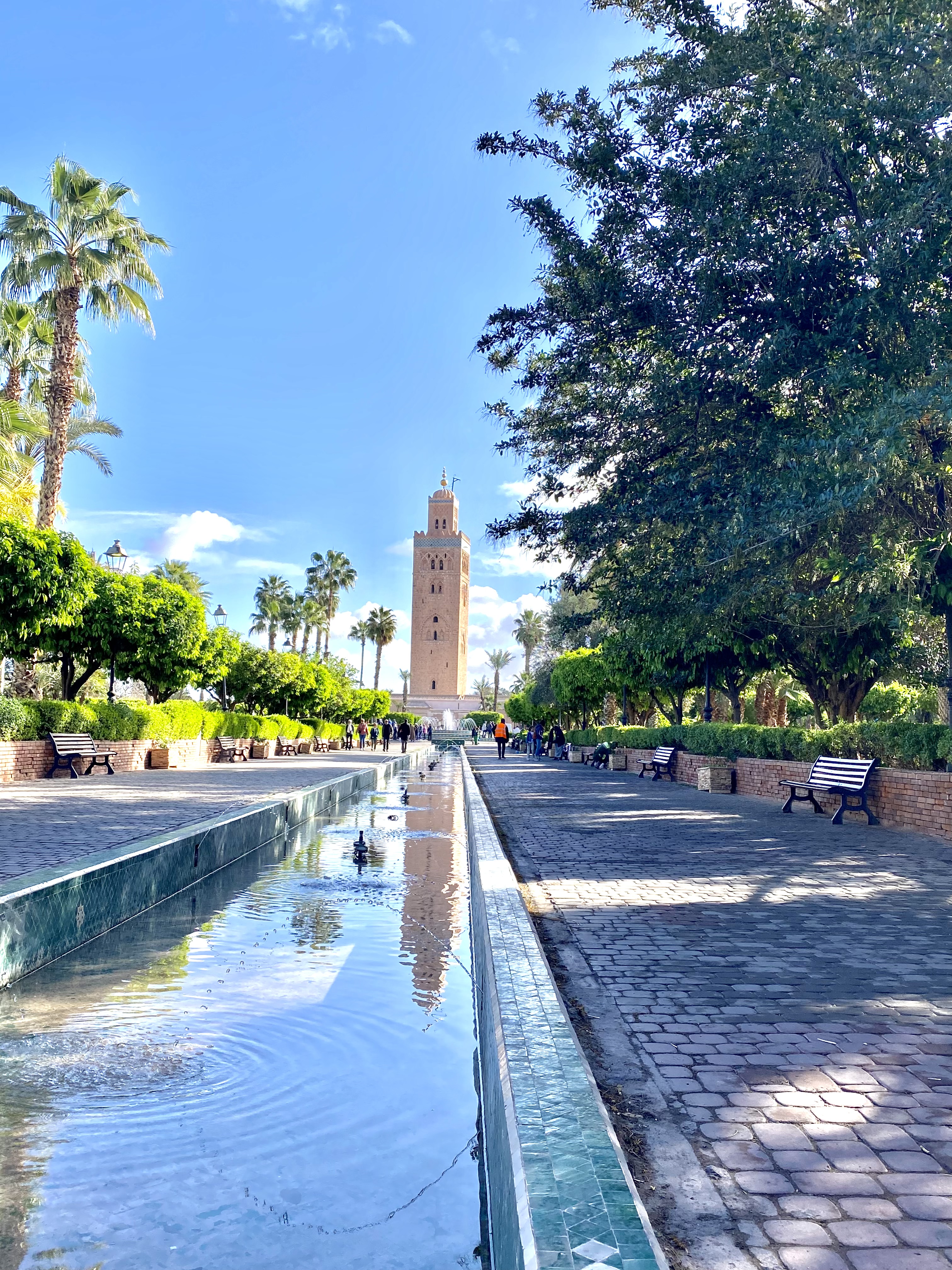 Les enfants étaient fatigués et nous ne quittons notre logement qu’à 9h30. Direction la Koutoubia, la plus grande mosquée de Marrakech. Elle est située dans le prolongement de la place Djemaa El Fna. Son minaret de 77 mètres se voit de partout et est devenu l’un des symboles de la ville. Pensez à vous promener aux alentours de la mosquée dans le parc de Lalla Hasna. C’est l’endroit idéal pour échapper un instant à la frénésie de Marrakech. Il y fait plutôt frais et il y a un belle fontaine… enfin quand elle fonctionne 😞. Pensez à prendre une photo de la Koutoubia se reflétant dans le bassin. C’est très instagrammable mais un peu cliché quand même 😌.