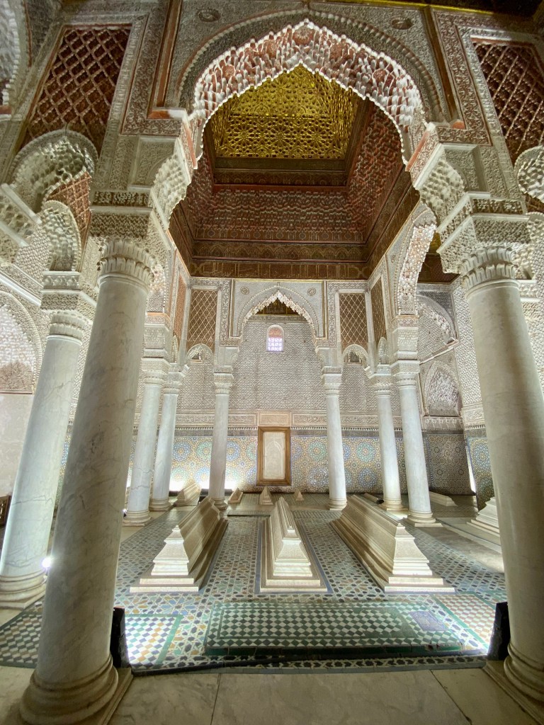 Nous profitons de l’après-midi pour aller admirer les tombeaux saadiens. Il faut absolument les voir. Sont-ils plus beaux que les tombeaux de Fès ? Chacun jugera. La salle dite des « Douze colonnes » est incroyable. Le site a malheureusement été endommagé par le tremblement de terre de 2023. Des fissures ont fragilisé l’édifice et la Mosquée Moulay El Yazid (qui ne se visite pas) est désormais maintenue par des contreforts 🥲