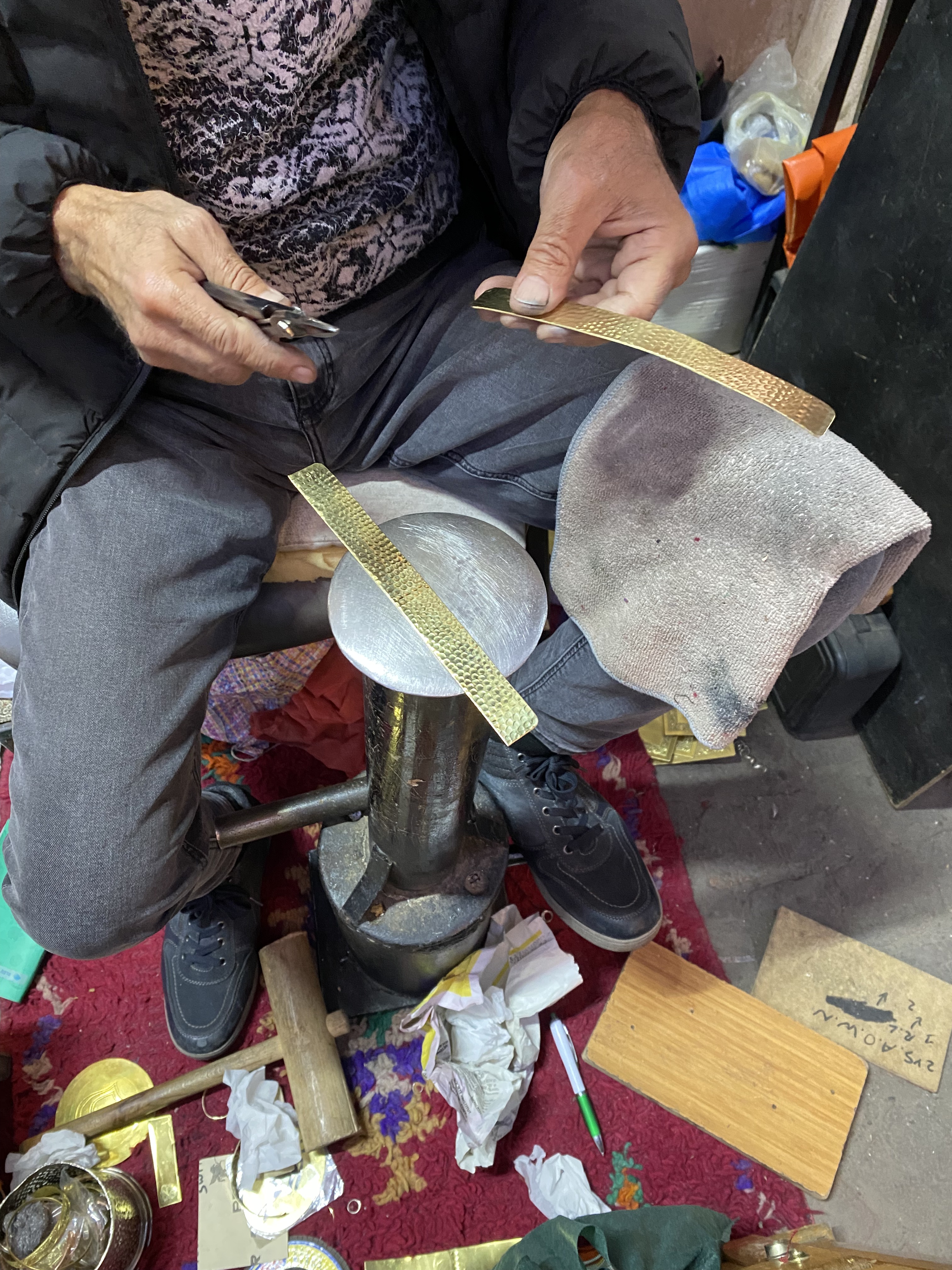 Après avoir mangé, nous traversons à nouveau la place Jemaâ el-Fna pour prendre la très jolie rue Riad zitoun el-Kédim qui mène au palais de la Bahia. Cette rue est très agréable. Sur la droite, au numéro 55, vous croiserez un artisan de talent : Youssef Bekkari (tél. : 06 (00212 657 595760). Il confectionne et grave des bijoux à la demande sous vos yeux. Très bon rapport qualité-prix. On y passe tous les ans ☺️. Margaux a eu son bracelet souvenir. 🥰