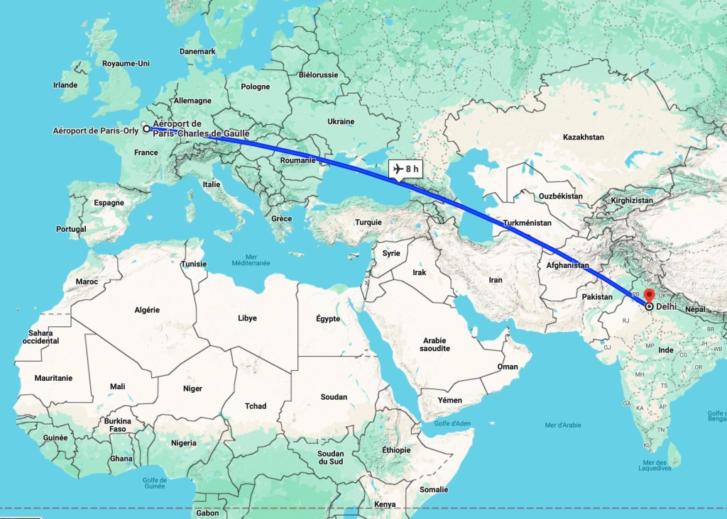 Avion : AR Lufthansa Paris CDG-Delhi (aller 10h20 de vol, escale comprise à Zurich : retour 11h25 de vol, escale comprise à Frankfort). Pour un vol direct Paris-Delhi, comptez environ 8 heures. Allez sur skyscanner pour Comparer les prix des vols.