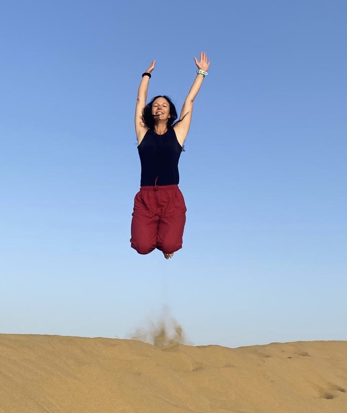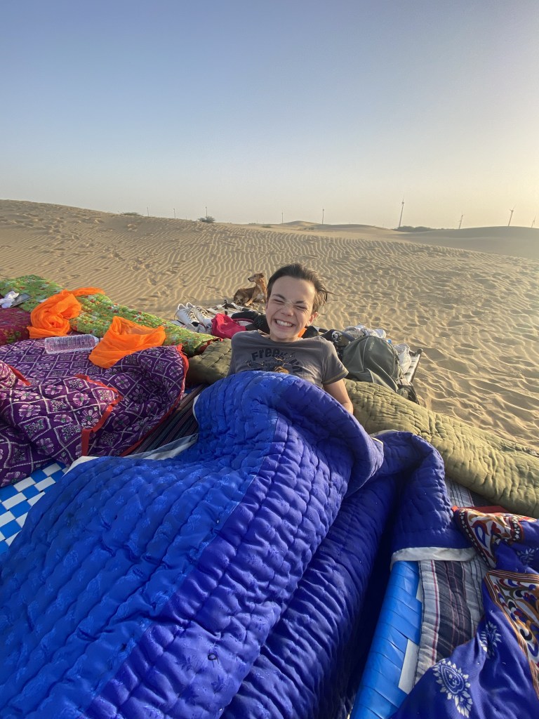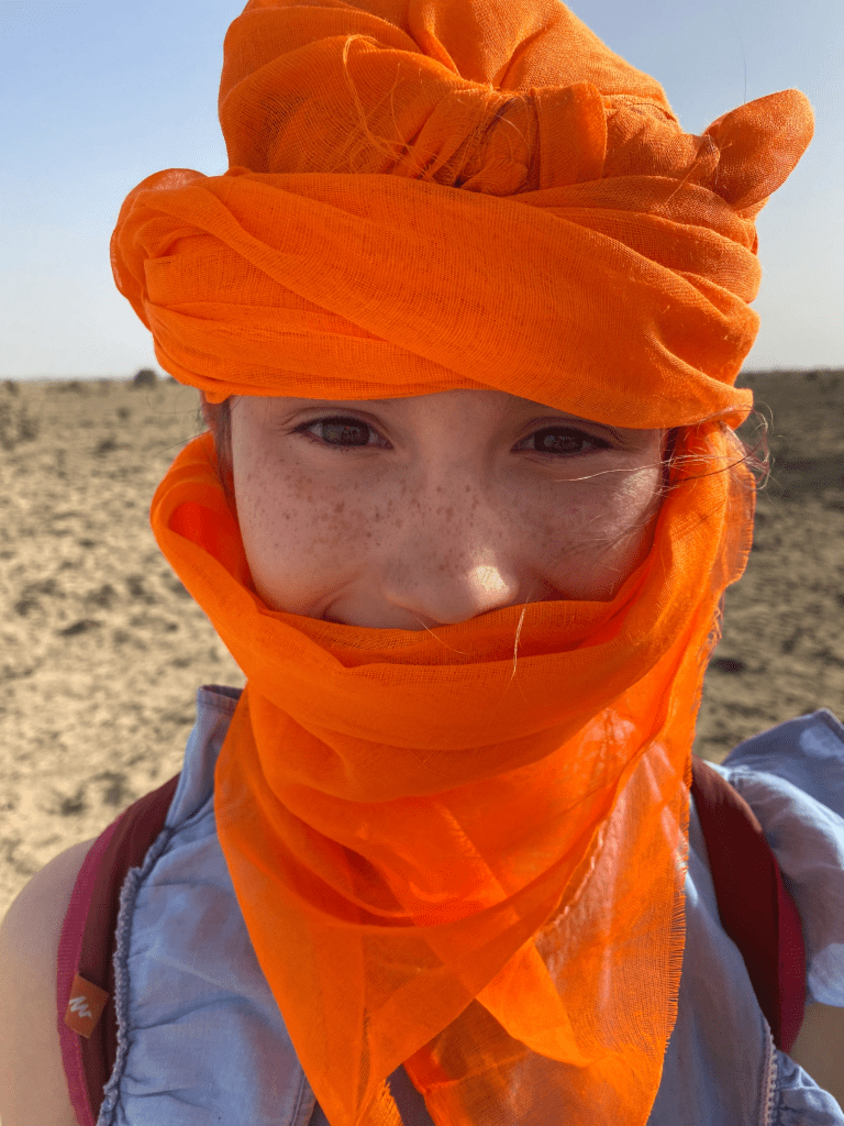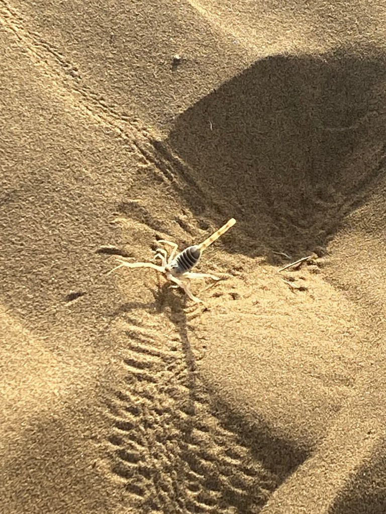 La nuit s’est bien passée sous le ciel étoilé… au milieu du désert à perte de vue. Nous n’avons pas eu froid. Nous nous réveillons de bonne heure. Sous notre lit, des centaines de traces de scarabées. A un mètre des couchages, Théo repère un gros scorpion blanc. Le guide se précipite pour le tuer d’un coup de chaussures. Ils ne sont pas mortels mais leur piqûre est très douloureuse. Chacun décide de mettre ses chaussures 😅.