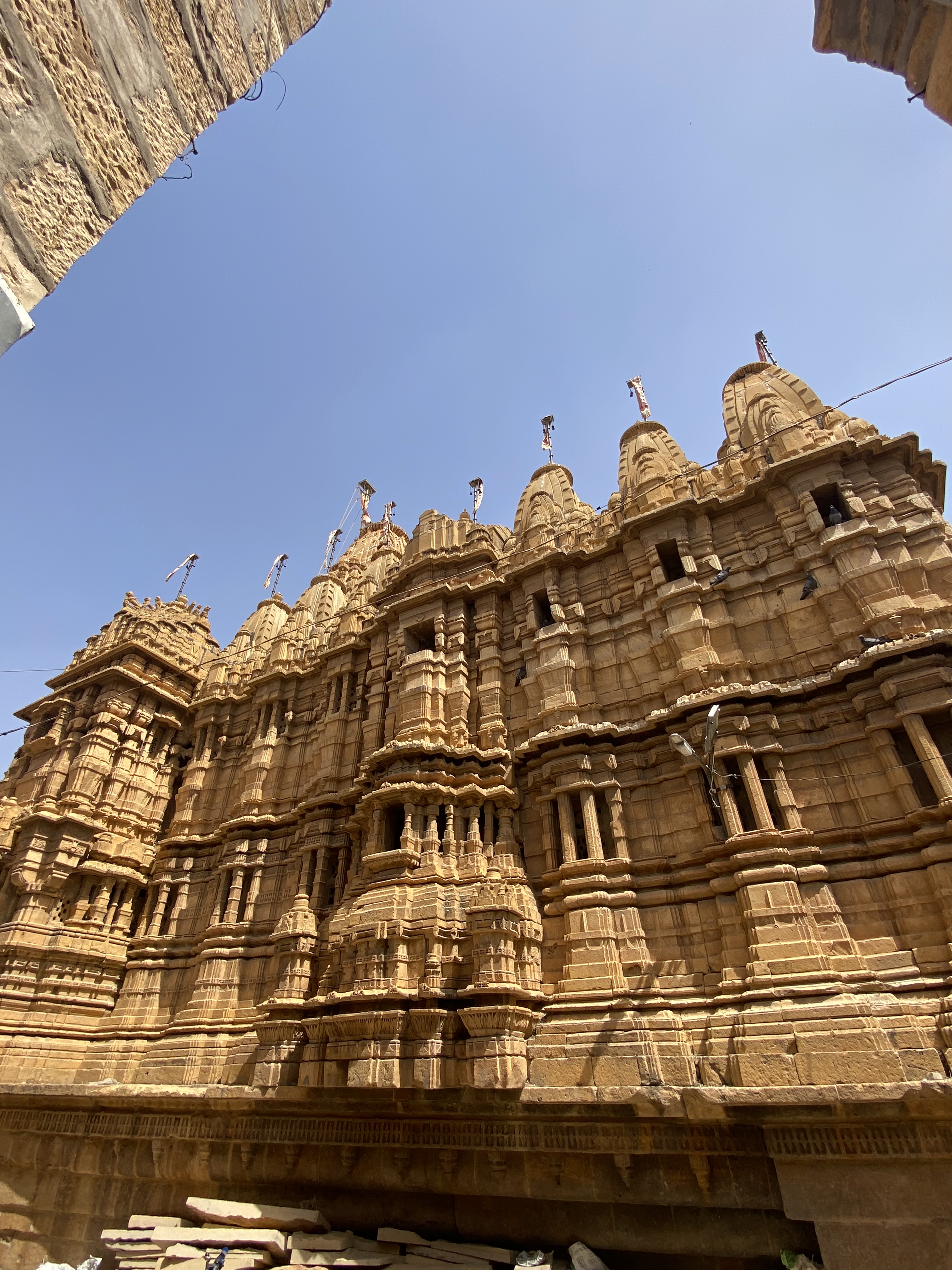 Tôt dans la journée, pendant qu’il fait encore un peu frais, nous engageons la visite du Fort de Jaisalmer. Les premiers rayons de soleil illuminent les murailles de grès jaune et nous comprenons pourquoi il est appelé le « Fort doré ». Encore une fois, c’est la démesure. Construit au XIIe siècle, ce fort serait tout bonnement le plus grand du monde. Des murailles de 30 mètres ont été bâties sur un promontoire rocheux qui domine la ville basse du haut de ses 100 mètres. L’enceinte fortifiée ondule sur 5 kilomètres et compte 99 tours défensives. Depuis le sommet, nous avons une vue incroyable sur la ville et sur le désert du Thar où il est prévu de passer la nuit prochaine à la belle étoile.