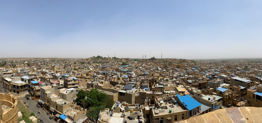Ou dormir à Jaisalmer ? … et où manger ? Nous descendons au Tokyo palace. Nous avons choisi cet hôtel pour sa piscine mais…. elle n’est malheureusement pas praticable. A cause de la chaleur, l’eau est verte fluo 🐸… c’est souvent le cas en fin de période touristique. Les enfants sont vraiment déçus et il vrai qu’avec 45° un petit bain aurait été appréciable. Les chambres ont été récemment rénovées. Ce n’est pas le luxe mais c’est tout de même très confortable. Mis à part un couple de japonais, nous sommes seuls dans l’établissement. C’est la basse saison, les touristes ont déserté les lieux et nous prenons goût au calme ambiant. Sur le toit de l’hôtel, une terrasse ombragée offre une belle vue sur la vieille ville et sur le fort. Le restaurant de l’hôtel est très convenable. En parlant de repas, petite précision qui n’est pas un détail, depuis le début du voyage, aucun de nous 5 n’a été malade. Il faut dire que malgré les tentations, et contrairement à ce que nous faisons en Thaïlande ou au Cambodge, nous n’avons jamais gouté la street food. Notre guide nous a clairement mis en garde. Il avait sans doute raison. A chacun de voir…