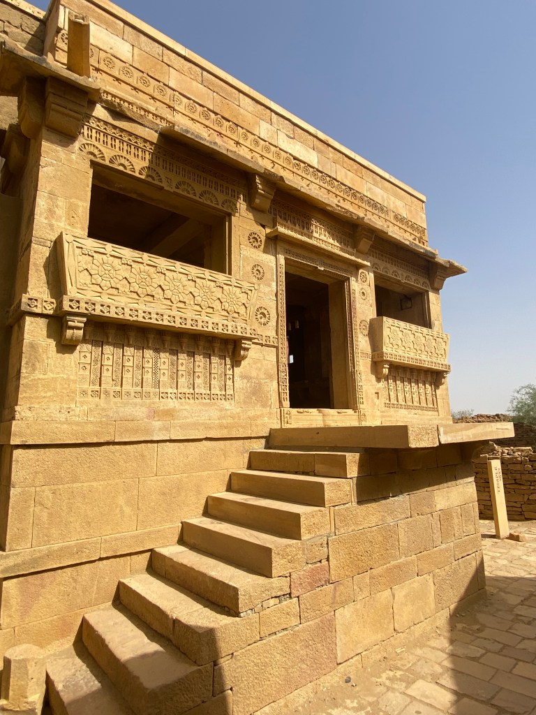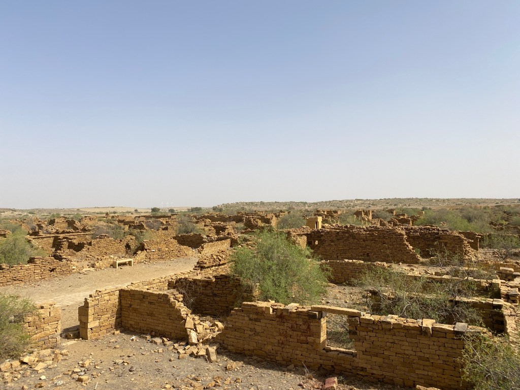 Nous partons en 4X4 en direction de Kuldhara, un village fantôme situé à 18 kilomètres de Jaisalmer. Au début du XIXe siècle, pour des raisons encore incertaines, les habitants ont brusquement fui les lieux. Ils auraient voulu éviter les représailles d’un chef local à qui le mariage avec une femme du village avait été refusé. Nous déambulons entre les ruines de plus de 500 maisons. Certaines ont été restaurées et on peut encore voir un temple et un puits à degrés plutôt bien conservés. Bon, c’est sûr,… si vous n’aimez pas les ruines, il ne faut pas venir ici. Nous, on a aimé ce lieu, … une sorte de Pompéi indien.