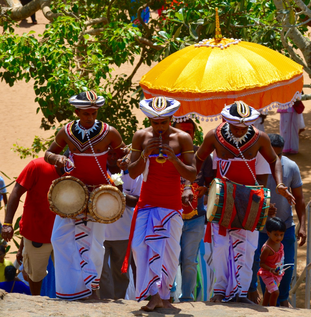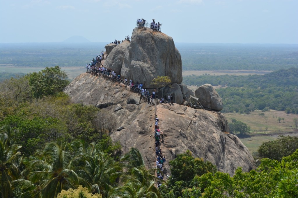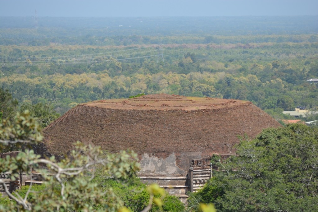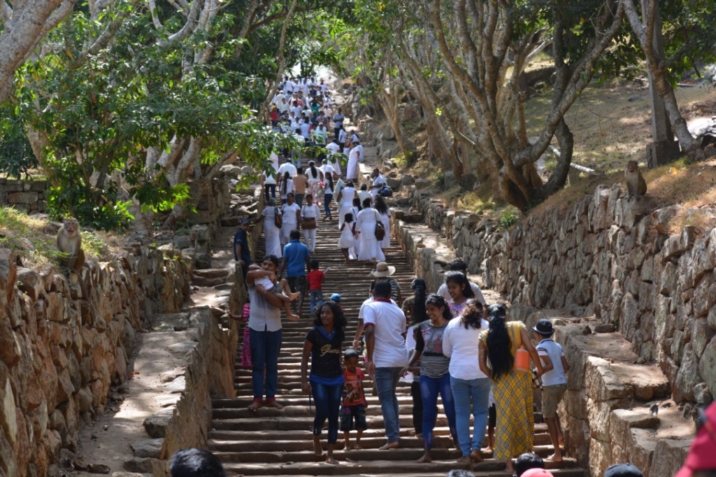 Sur le sommet de la colline, le stupa blanc Maha Saya est celui qui renfermerait les reliques du moine Mahinda. La vue est magnifique. On s’aperçoit de la richesse et de la beauté du site. Ça valait la peine de faire tant d’efforts. En redescendant nous croisons une procession religieuse qui rajoute à l’authenticité du lieu.