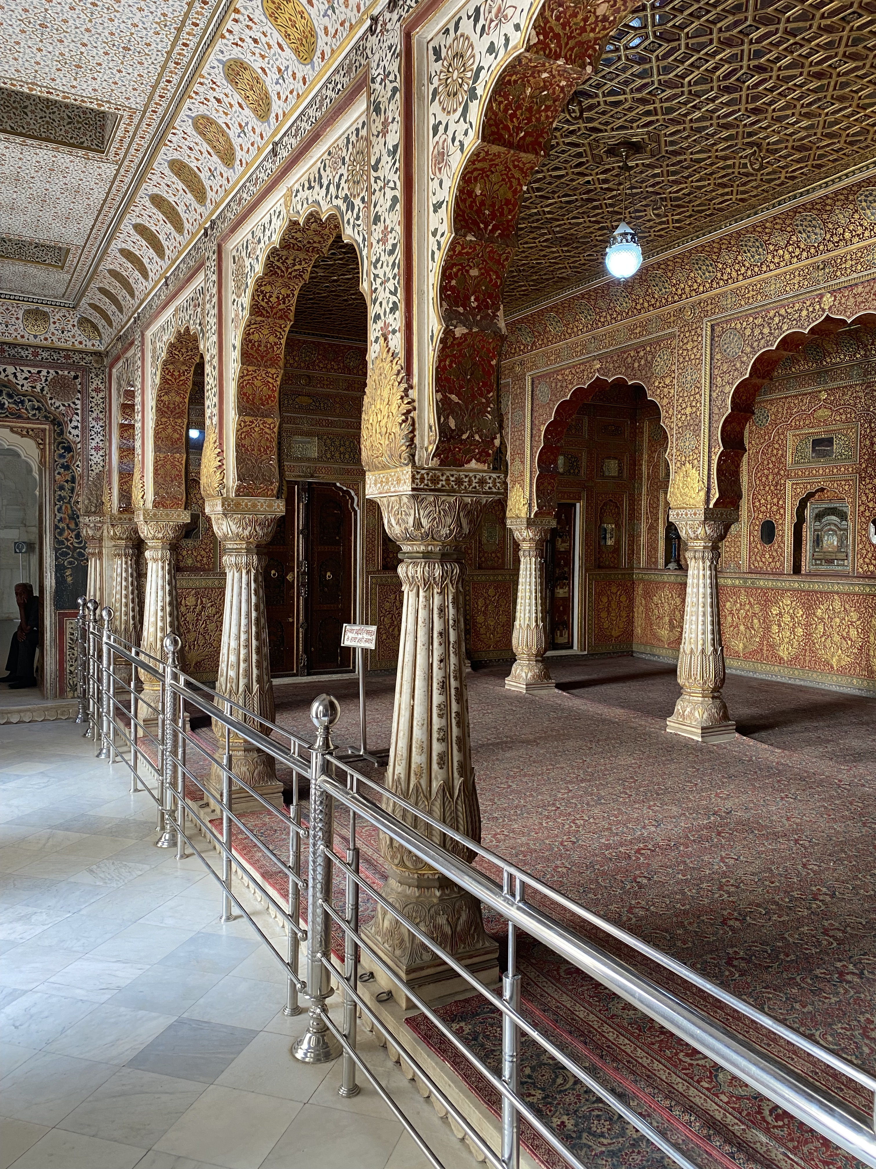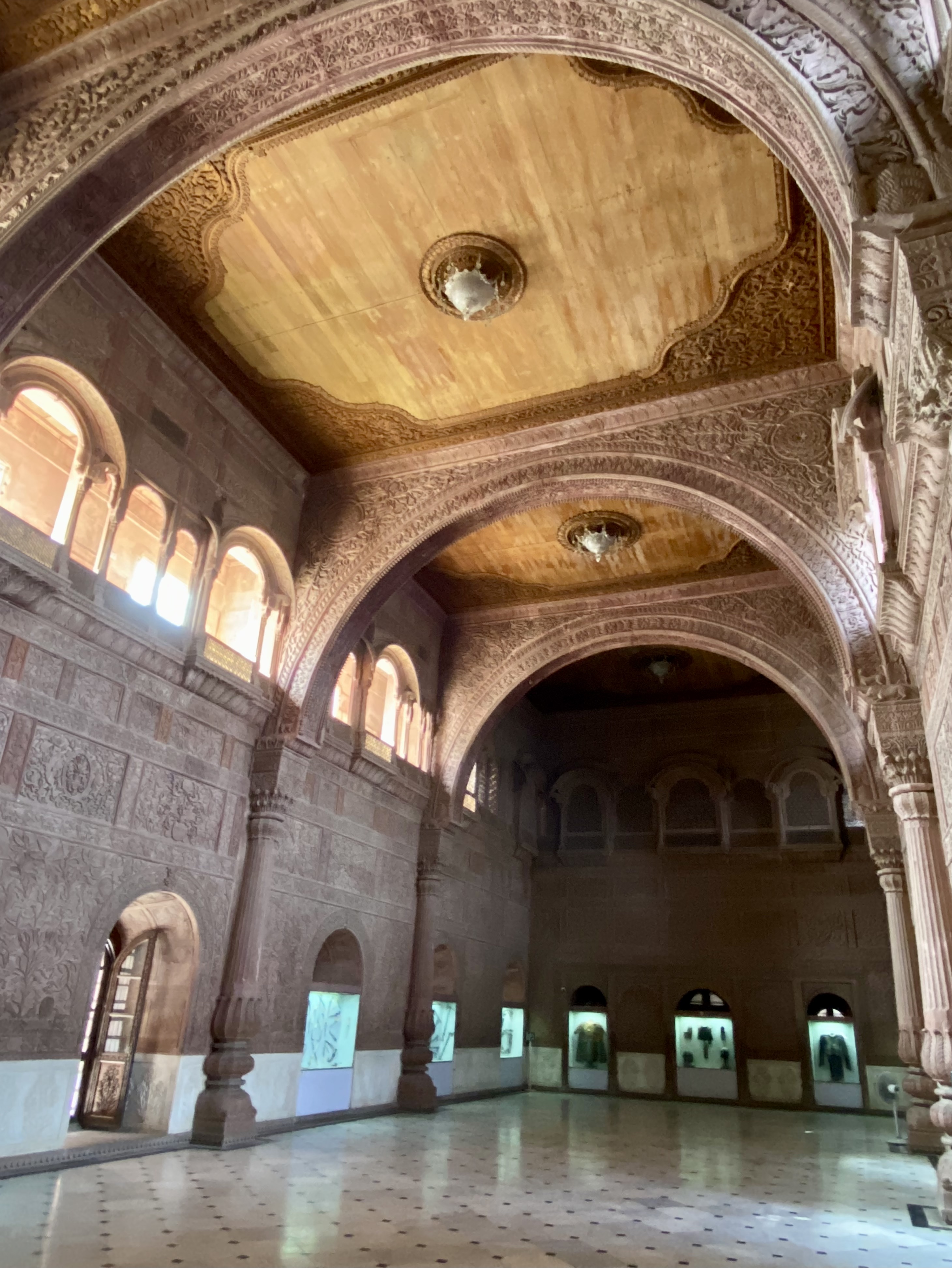 A l’intérieur de la forteresse, le calme règne et c’est un labyrinthe de cours intérieures, d’escaliers et de couloirs. L’enceinte comprend plusieurs palais : Anup Mahal, Chandra Mahal, Phool Mahal. Les pièces sont richement décorées et ont conservé meubles et ornementations de la grande époque des maharadjas. On peut visiter la salle du trône, la chambre du maharadja et la salle du conseil dans laquelle on découvre avec stupéfaction un avion biplan de type Havilland. On peut visiter un petit musée dans lequel sont exposés objets d’arts, armes et nacelles d’éléphants.