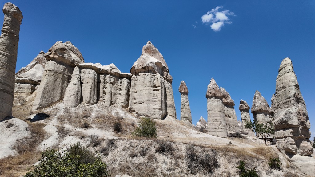Le parc national de Göreme offre de nombreuses possibilités de randonnées. Nous partons en début d’après-midi (pas forcément l’idée du siècle 🥵) pour faire la boucle « Göreme – Love valley – White valley – Uchisar Castel – Pigeon valley – Göreme ». Il est très simple de la faire en autonomie grâce à l’application AllTrails.