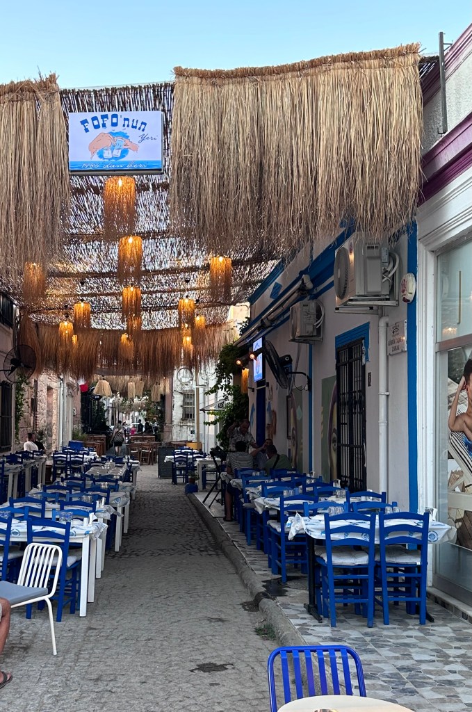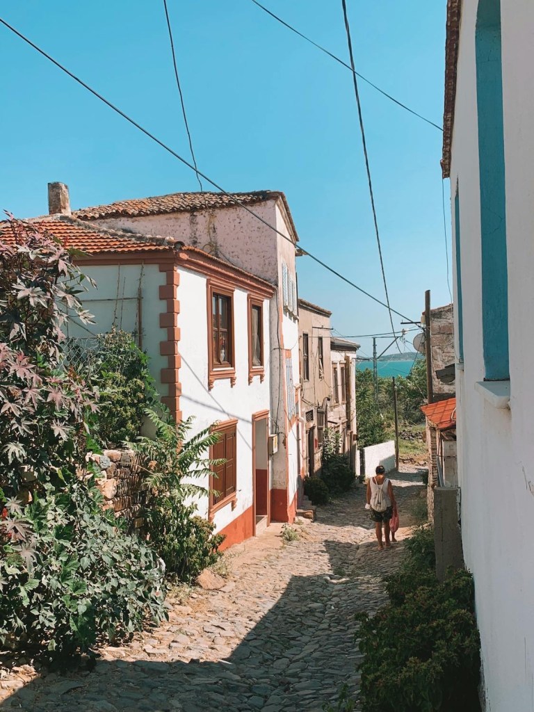 Le centre historique de la ville est très petit (à peine 2,5 km2). Nous passons devant les maisons centenaires aux couleurs pastel de la rue Kemalpasa. C’est très agréable de se balader dans ces ruelles ombragées. Il y a de nombreux commerces, des restaurants… et l’architecture typique des maisons grecques. Les murs blanchis à la chaux, les volets bleus, les immenses bougainvilliers, les glycines… Dans ce tableau idyllique, le seul bémol est qu’il y a quand même pas mal de touristes.