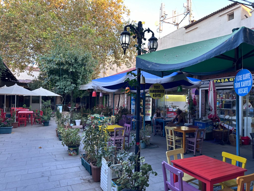 Nous avons bu un verre sur une terrasse à l’écart des regards et des passants au Minta bahçe qu’on recommande chaudement ❤️❤️. On passe par la cuisine pour accéder à une terrasse ombragée. L’ambiance est familiale et la cuisine aussi. C’est un vrai havre de paix ! Il est possible de manger mais nous n’avons pas testé la restauration. Mezze et plats entre 15 et 30 TL. Il y a de nombreux plats végétariens et les célèbres feuilles de vigne.