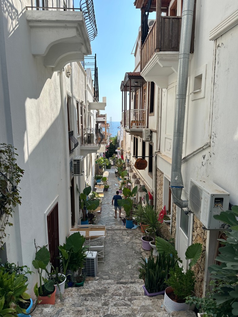 Kalkan est une très jolie station balnéaire à flanc de montagne. Nous avons été charmés par l’endroit. Cet ancien village de pêcheurs est aujourd’hui devenu un endroit plutôt chicos. Il y a pas mal de touristes mais peut-être un peu moins que dans les autres stations balnéaires où nous sommes passés. C’est la Turkish Riviera 😂. Les étroites ruelles ombragées qui descendent vers le front de mer sont très agréables. La plage située à proximité du port est relativement petite mais sympa et nous y restons une heure le temps de se baigner un peu et de prendre un verre.