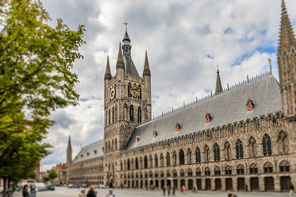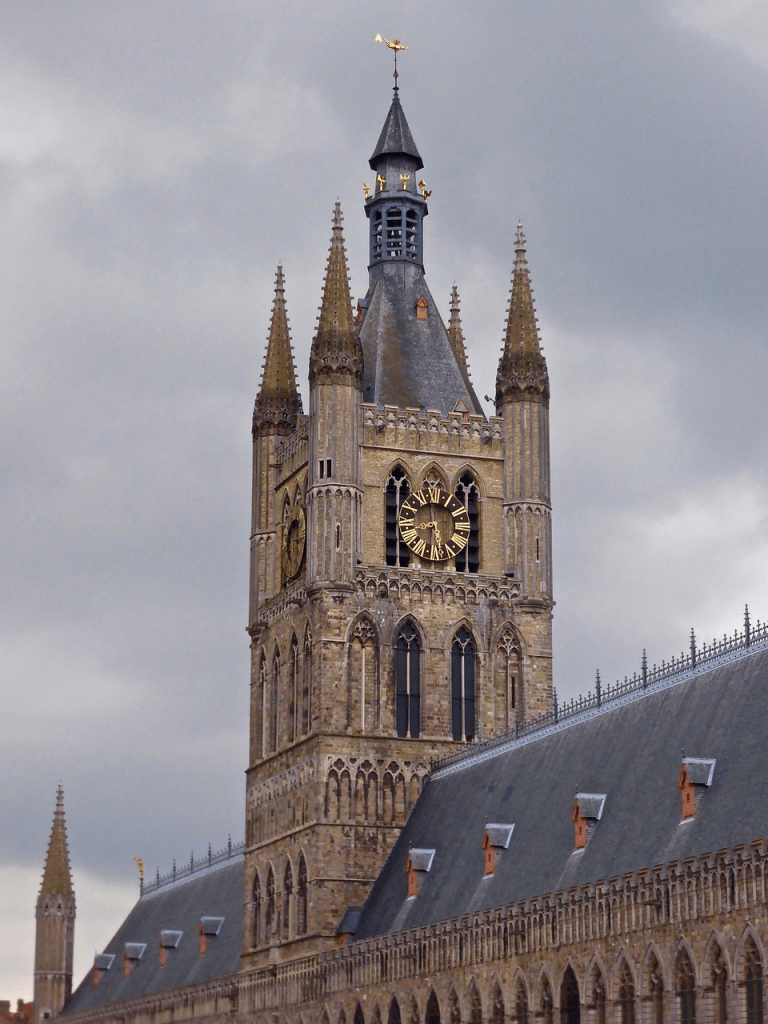 C’est un bâtiment de style gothique aux dimensions impressionnantes qui fut achevé en 1304 pour tenir lieu d’entrepôt et de marché aux tissus. C’est l’un des plus grands monuments communaux du Moyen-Age. Il faut savoir que Ypres est, avec Bruges et Gand, l’une des plus grandes villes drapières du Moyen-âge. Réduite à l’état de ruines pendant la première guerre mondiale, la halle a été reconstruite à l’identique de 1933 à 1967. Le bâtiment abrite aujourd’hui la mairie, le musée In Flanders Fields consacré à la grande guerre, le centre des sciences et l’office du tourisme.