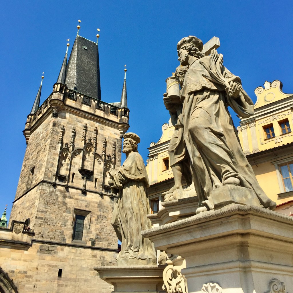 Nous arrivons sur le très célèbre pont Charles qui relie le quartier de Malá Strana à la vieille Ville. Il doit son nom à Charles IV qui l’a fait construire au XIVe siècle. C’est un des symboles de Prague.