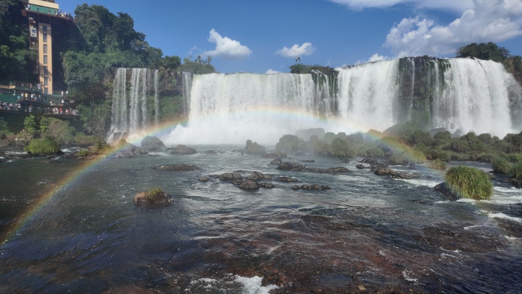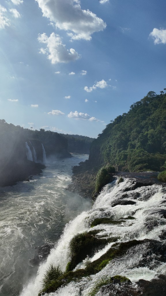Une fois entrés sur site, un bus nous conduit au départ du sentier menant aux chutes. Au bout d’un peu plus d’un kilomètre, nous descendons et apercevons les chutes argentines qui forment comme un immense amphithéâtre. Le bruit de l’eau qui tombe depuis le plateau de basalt de Serra Geral est assourdissant. Nous passons sur une passerelle qui mène à une première cascade de plus de 82 mètres de haut. C’est grandiose 🤩.