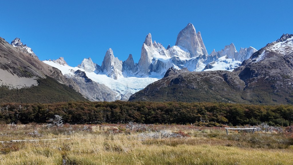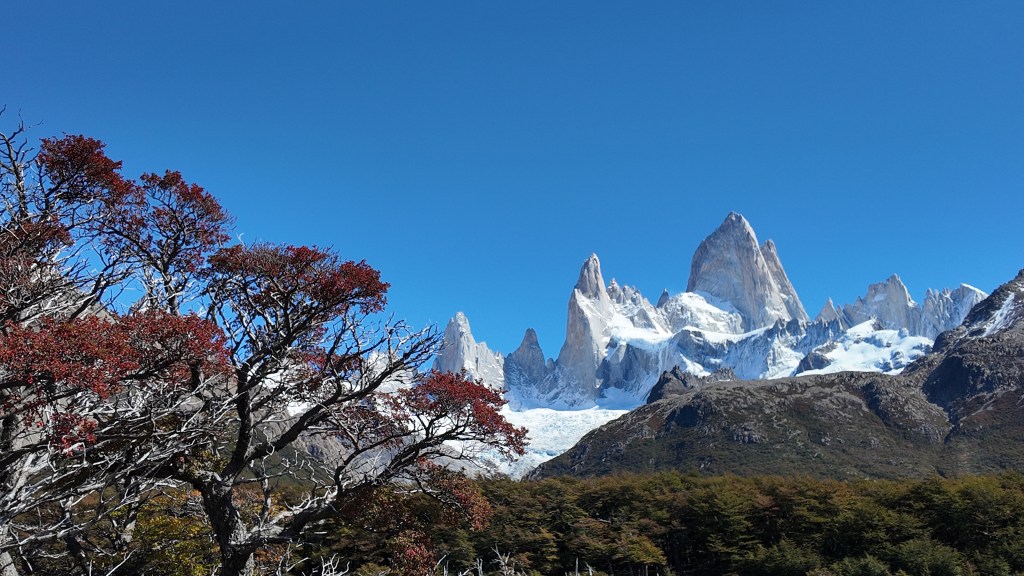 Le Fitz Roy est un gigantesque bloc de granit de forme pyramidale. Nous avons la chance incroyable de pouvoir l’admirer sous un beau ciel bleu et sans aucun nuage pour obstruer la vue. De gauche à droite, nous voyons cinq pics rocheux : le Saint-Exupéry, le Poincenot, le Fitz Roy, le Mermoz et le Guillaumet. Tout cela dessine la fameuse skyline qui a inspiré le logo de la marque Patagonia.