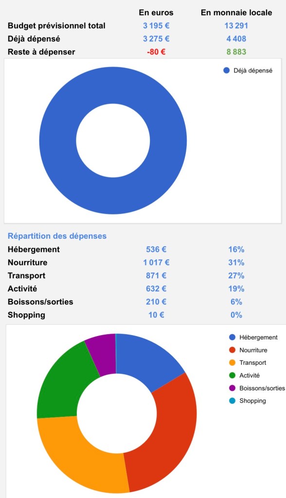– Activités (excursions guidées, accès aux sites historiques…) : 632 € (19% du budget total).