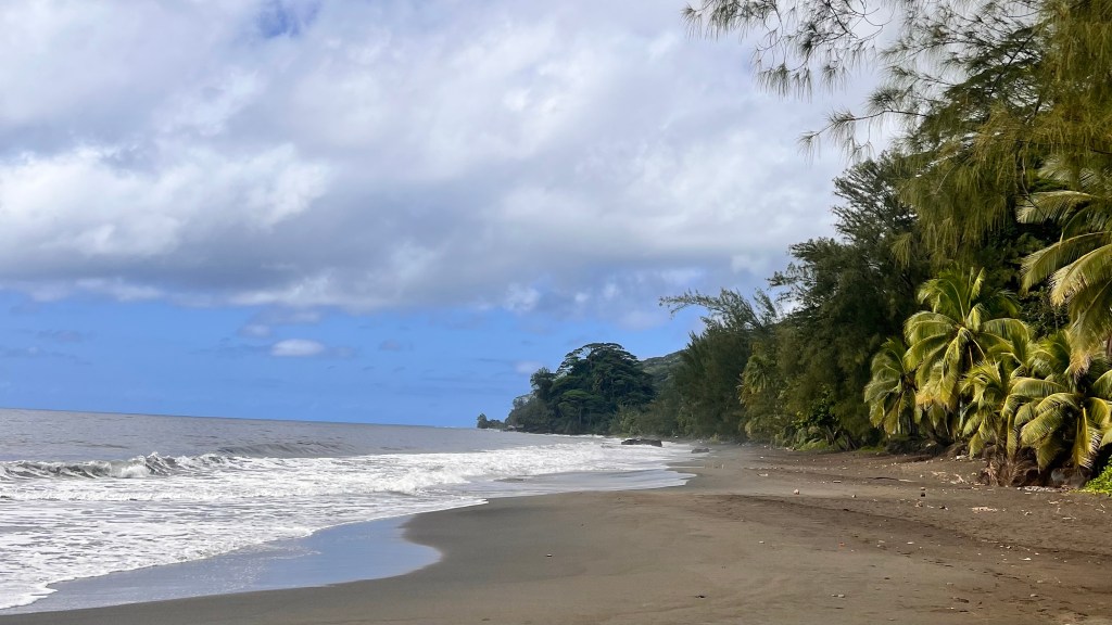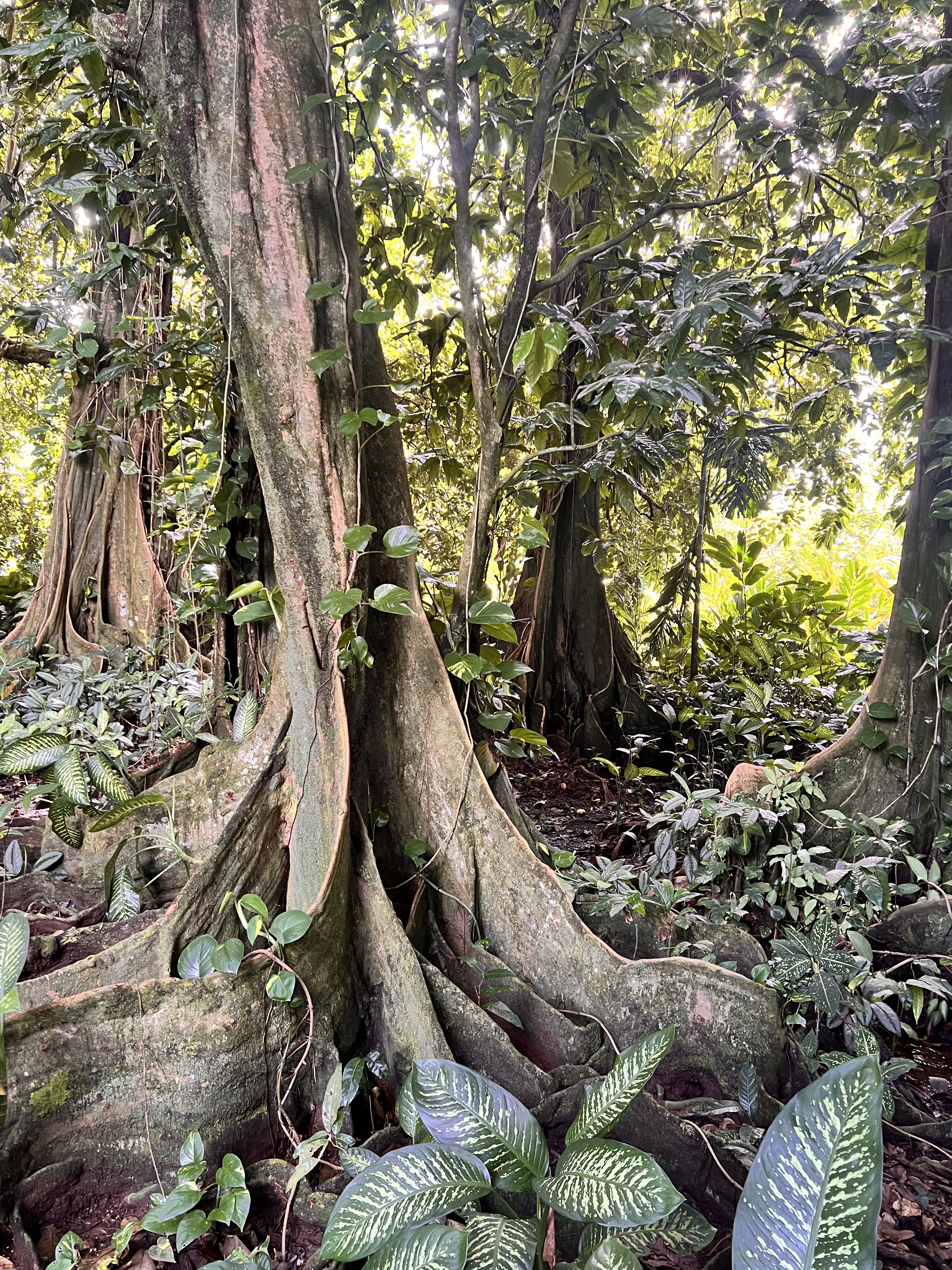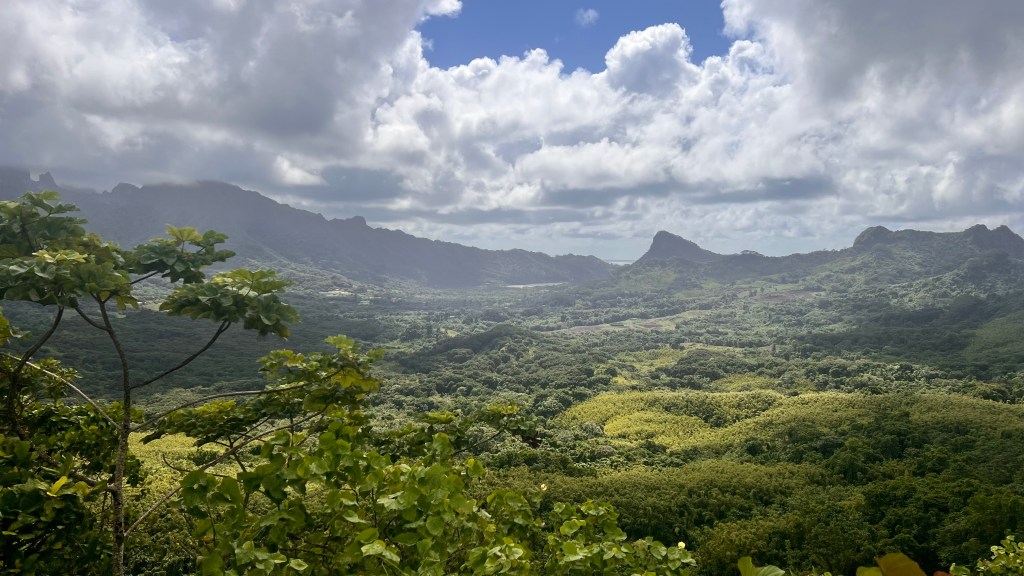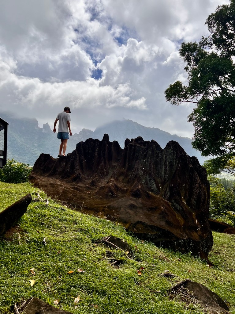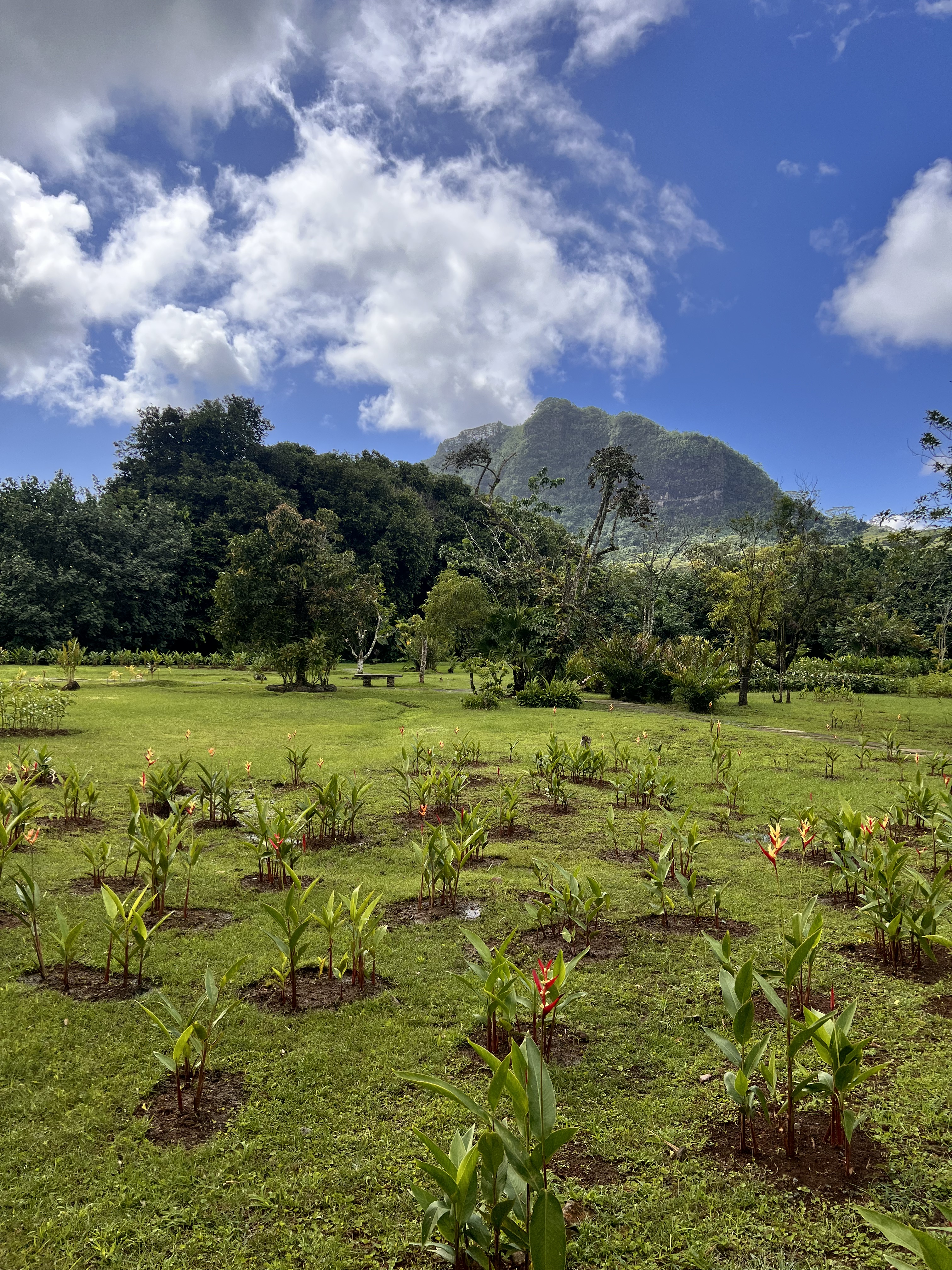 Nous nous arrêtons au Jardin botanique de Faaroa qui se trouve dans la commune de Taputapuatea. C’est un site public et gratuit particulièrement bien aménagé. On y trouve des espaces dédiés à différents types de végétations : plantes du littoral et de montagne, plantes ornementales et plantes des vallées humides. Il y a pas mal de panneaux explicatifs sur la flore. On y voit des Mapé, le châtaignier polynésien, et des ‘o’a, également appelé arbres centenaires, dont le bois est utilisé en construction et l’écorce comme matière tinctoriale. Il y a aussi des ficus, des plantains de montagne et bien d’autres espèces. Le site est vraiment magnifique.