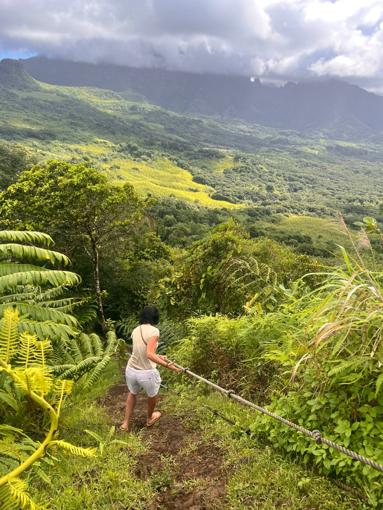Nous reprenons la voiture en direction de la crête des Macaranga où une petite randonnée est possible (Distance 1,3 km ; Durée : de 40 min. à 1h30 aller-retour selon votre niveau ; Dénivelé positif de 147 m.). Nous marchons le long du rebord de la caldeira du volcan qui a donné naissance à l’île. Le chemin est glissant mais ne présente pas de difficulté particulière. Une corde à noeuds facilite la progression lorsqu’on arrive à proximité du sommet. Nous marchons dans une forêt naturelle mésophile où se trouvent de nombreuses orchidées, des fleurs odorantes et d’autres dites « en pompons rouges ». Nous sommes accompagnés par le chant de la cigales bleue endémique de Raiatea et par les cris des martins chasseurs et des pigeons verts. Au sommet, on a la plus belle vue sur la vallée de Faaroa et sur la baie de Faatemu au Sud de l’île. Cette vallée abrite les plus grandes bambouseraies de toute la Polynésie française.