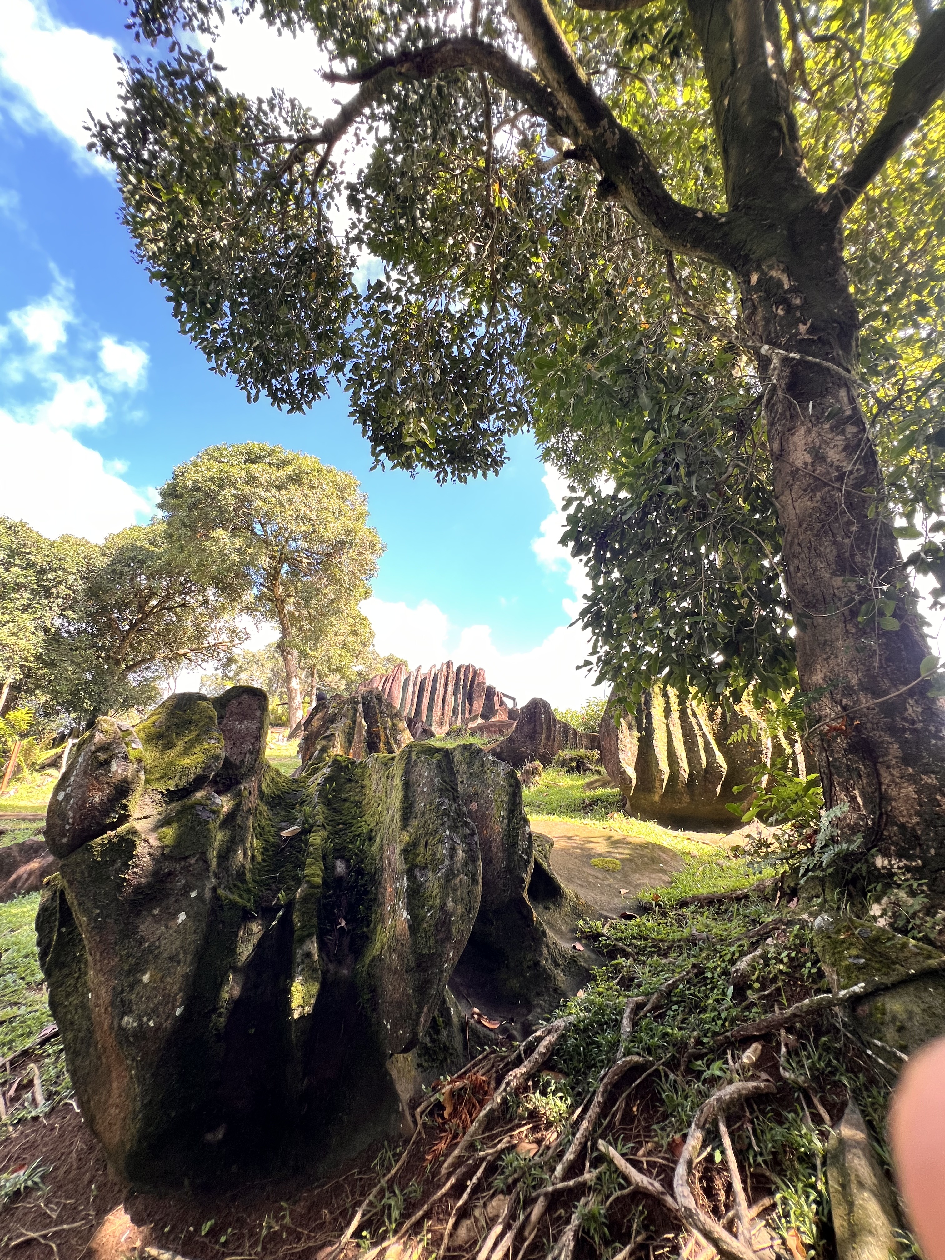 Nous continuons notre tour en direction de la Promenade des Gabbros (330 mètres ; 20 min. aller-retour). L’effondrement du volcan a créé une dépression de 10 kilomètres sur 6 qui est délimitée par une ligne de crête dont le point culminant est le Mont Tefatua (1 024 mètres). Des roches volcaniques affleurent un peu partout. Ce sont les fameux gabbros sur lesquels l’érosion a creusé comme des gouttières. L’accès à ce petit site est gratuit (temps de visite : environ 30 min.).
