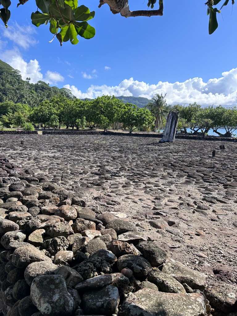 Nous prenons la direction du Marae Taputapuâtea. C’est un grand site archéologique dont l’origine remonte de 1200 à 1700 avant J.-C. (la date exacte n’a jamais pu être arrêtée avec précision). Ce site est bien plus grand que ceux que nous avons vu sur l’île de Huahine (voir notre article). C’est un ensemble de constructions en dalles de corail et de basalte. Au milieu d’une sorte de place où avaient lieu des cérémonies une grande dalle de basalte de 3,65 mètres a été érigée. Elle fait penser à nos menhirs. Certaines dalles de ce Marae ont été transportées dans les autres îles polynésiennes comme pierres fondatrices d’autres Marae et l’on peut donc dire que c’est le Marae originel.