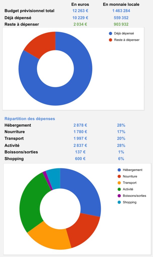 Notre budget prévisionnel était de 12 263€ pour 5 et pour 27 jours soit 91 € par jour et par personne.