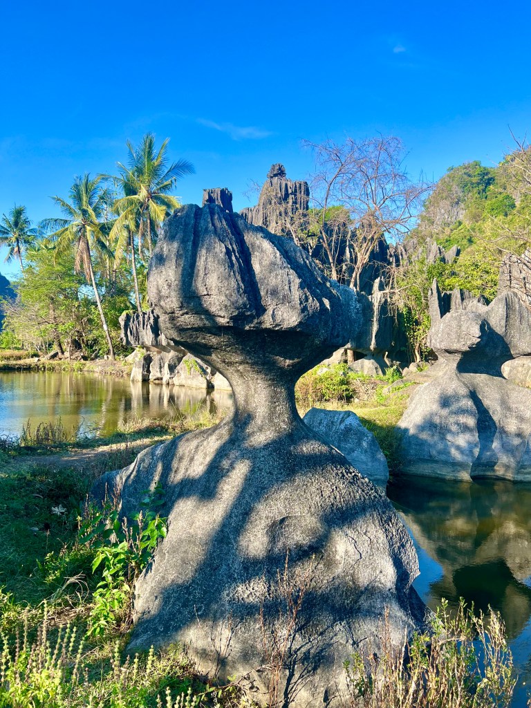 Nous reprenons le bateau pour nous rendre à Stone Field. Nous sommes toujours sur la rivière Pute mais entourés cette fois-ci d’imposantes formations karstiques. Une fois arrivés à l’embarcadère de Stone Fields, un vieil homme nous réclame 20 000 roupies pour accéder au site et nous lui donnons sans trop nous interroger sur la légitimité de sa demande. Il faut une heure environ pour se balader sur le site où se trouvent d’impressionnantes roches karstiques.