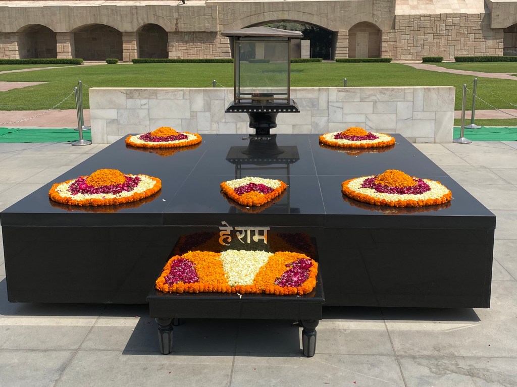 Le nom indien de ce mémorial est Raj Ghat. C’est là qu’a eu lieu en 1948 la crémation du Mahatma Gandhi, le père de l’indépendance et de la désobéissance pacifiste. Nous traversons de grands jardins avant d’arriver au mémorial. C’est une grande plateforme de marbre noir sur laquelle est inscrit « Ô Rāma » qui veut dire « Ô Dieu ». Des indiens se recueillent avec beaucoup d’émotion devant une flamme éternelle.