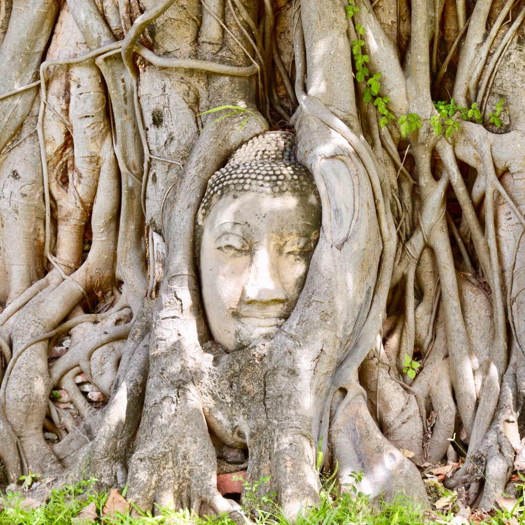 Nous nous rendons en premier lieu au Wat Mahathat qui est un des sanctuaires les plus connus (numéro 1 sur la map). C’est celui où se trouve la fameuse tête de bouddha emprisonnée dans les racines d’un banian. Ce temple est particulièrement endommagé. Il ne reste plus que la base du stupa central, la structure en forme de cloche.