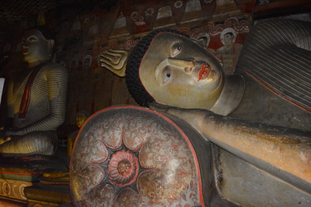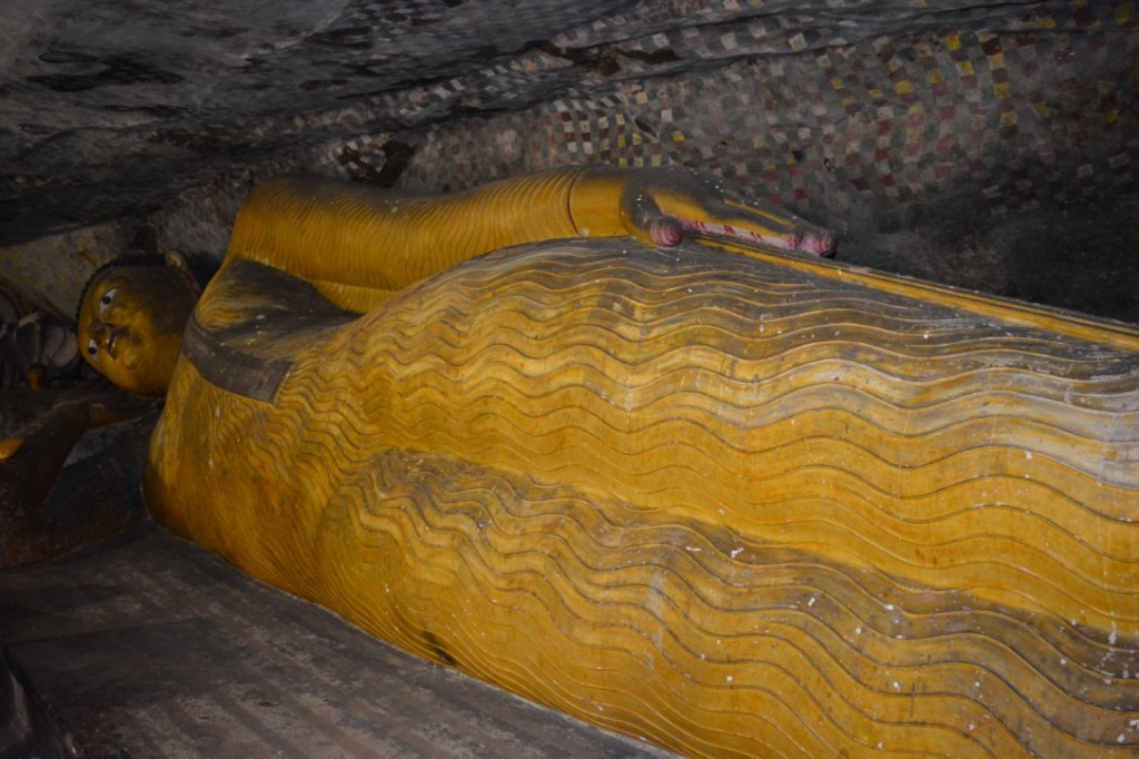 La « Grotte du Roi Divin » est sans doute la plus connue des cinq. Elle abrite un immense Bouddha de 14 mètres couché sur son flanc droit et s’apprêtant à entrer dans le paninirvana, le nirvana ultime qui met fin au cycle des renaissances. C’est la dernière phase de la vie de celui que l’on nomme l’Éveillé. Les détails de cette statue peinte et dorée sont d’une grande finesse. Les plis du coussin sur lequel il pose sa tête semblent réels et des fleurs de lotus sont peintes sous ses pieds. La statue a été directement sculptée dans la roche au Xe siècle juste avant la chute d’Anuradhapura. Bouddha est entouré de ses disciples et la divinité Vishnu est également présente. Les plafonds et les murs sont couverts de fresques racontant la vie de Bouddha. Il y a dans le clair-obscure de ce temple une atmosphère mystique.
