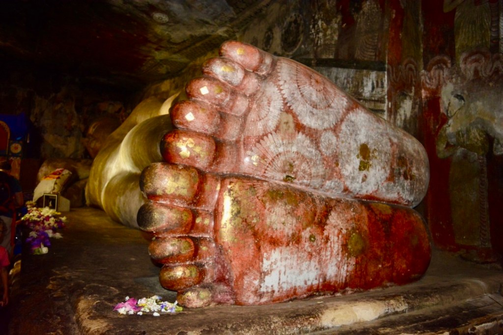 Une fois l’escalier monté, on a depuis le belvédère une vue d’exception sur la vallée du triangle d’or et l’on aperçoit même très bien le Rocher du Lion de Sigiriya. Les temples troglodytes sont nichés devant nous dans un repli de l’imposante falaise de granit. Sur les 80 que compte le site, il n’est possible que d’en visiter cinq. Nous ne sommes pas très nombreux sur place. L’extrême chaleur semble avoir découragé les touristes. Avant de pénétrer dans cette enceinte sacrée, nous devons nous déchausser et là ça devient un vrai calvaire. Le sol est brûlant. 🔥 Porter des chaussettes est autorisé et peut s’avérer utile pour les pieds sensibles.